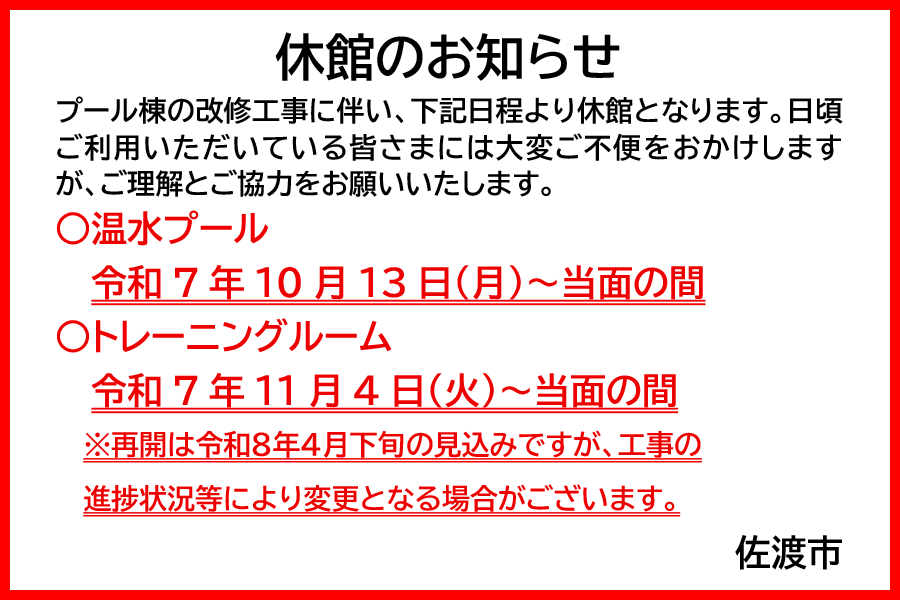 - 温水プールの改修工事を行う予定となっており、令和7年9月29日(月)から休館となる可能性があります。※詳細については、日程が決まり次第お伝えいたします。