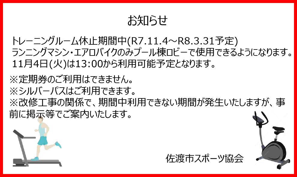- トレーニングルーム休止期間中(R7.11.4~R8.3.31予定)ランニングマシン・エアロバイクのみプール棟ロビーで使用できるようになります。11月4日(火)は13:00から利用可能予定となります。