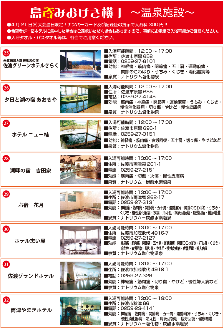 せっかく佐渡に来て頂いたのなら、満足して帰ってほしい!!また来たい島だなと思ってもらいたい!!!大会前日・当日、両津の飲食店・お土産や・温泉施設の値引きや特別サービスなど、「がんばって」「おつかれさま」の気持ちを込め、精一杯のおもてなしをさせて頂きます。