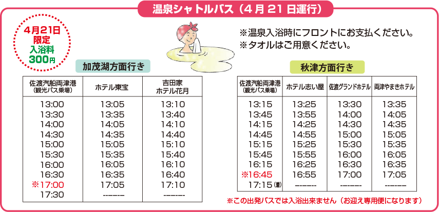 温泉施設紹介・シャトルバス時刻表 ※温泉施設は4月21日のみ