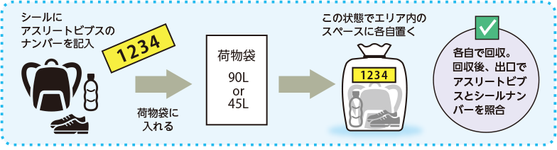 - 引取り時は手荷物袋シールとアスリートビブスのナンバーが一致しているか、エリア出口でスタッフが確認します。
