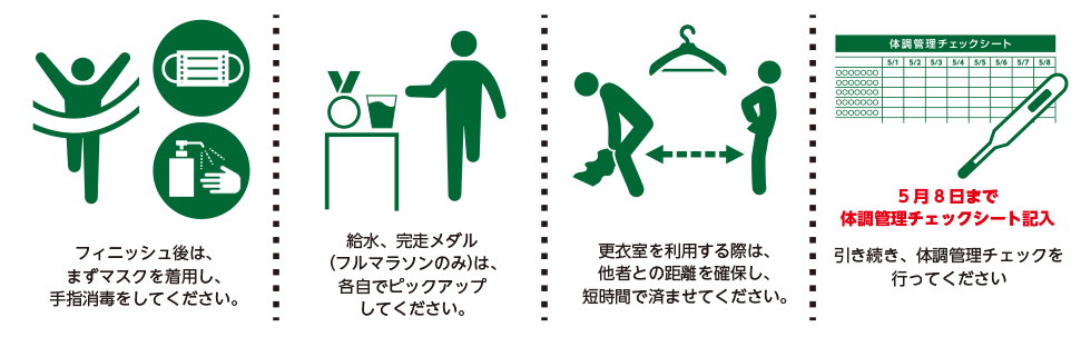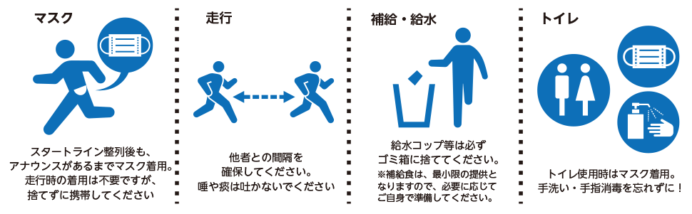 - ランナー受付や大会当日の入場ゲート等での検温を実施いたします。37.5℃以上の場合は、大会への参加をお断りします。