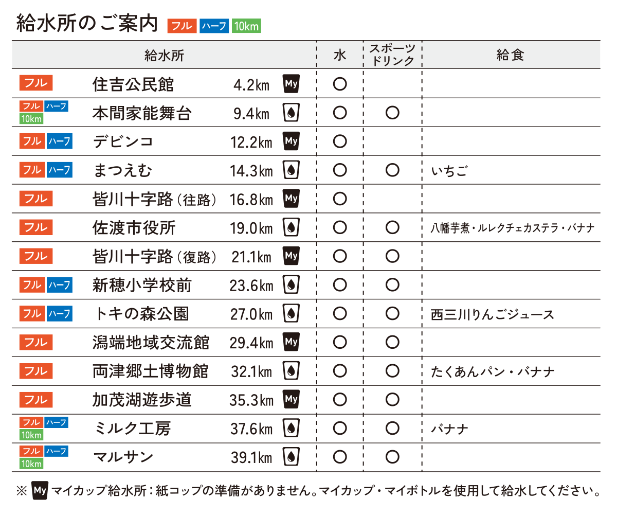 ・一部の給水所(日吉神社前・佐渡市役所・両津郷土博物館)では佐渡うめえちゃ給食を用意しておりますが、数に限りがありますので、ご自身で補給食を携帯することをお勧めします。