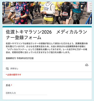 佐渡トキマラソンでは参加ランナーの皆様が安心して参加いただけるよう、医療救護の体制を整えていますが、さらなる充実を図るため、大会に参加される医療関係者の皆様に「メディカルランナー」としてご登録をお願いしております。レース走行中に万が一の場合は、初期対応等にあたっていただきますようご協力をお願いします。