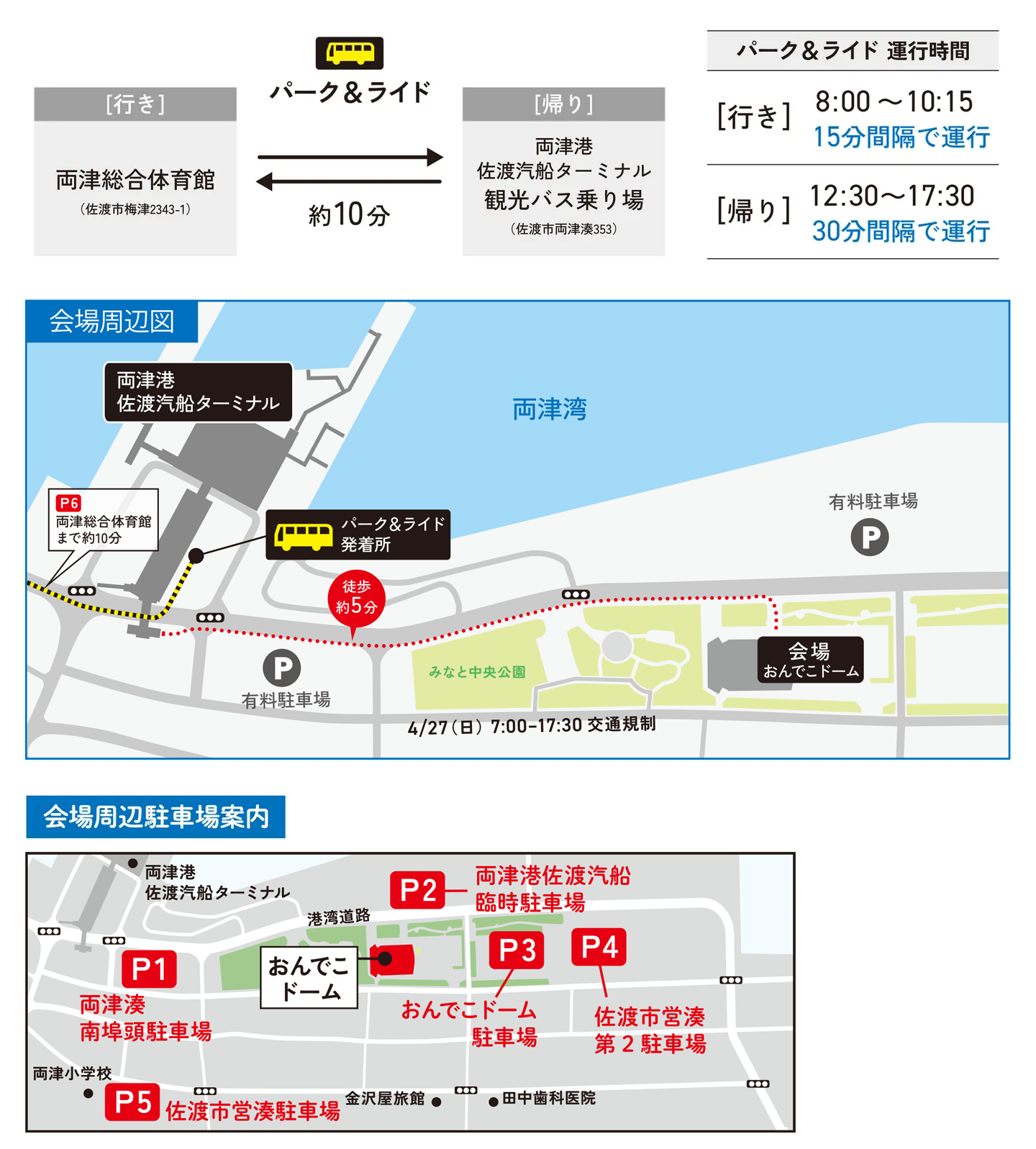 会場 会場 参加案内トップに戻る パーク&ライド 会場図 パーク&ライド 4月27日㈰は、両津総合体育館 ⇔ 佐渡汽船ターミナル間で無料シャトルバスが運行しておりますので、ご利用ください。 特別協賛 協 賛