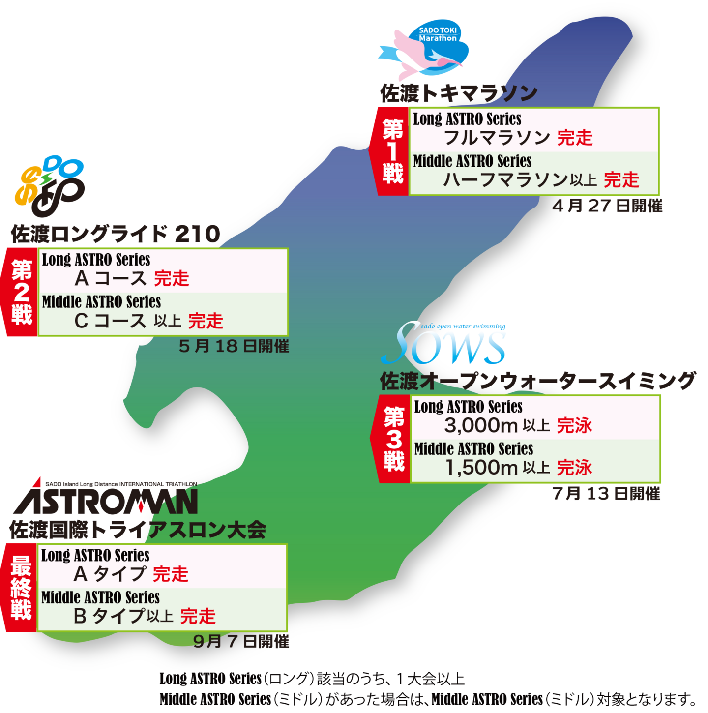 「佐渡トキマラソン」「佐渡ロングライド 210」「佐渡オープンウォータースイミング」「佐渡国際トライアスロン大会」、4つのイベントに挑んで、その称号を手に入れよう。