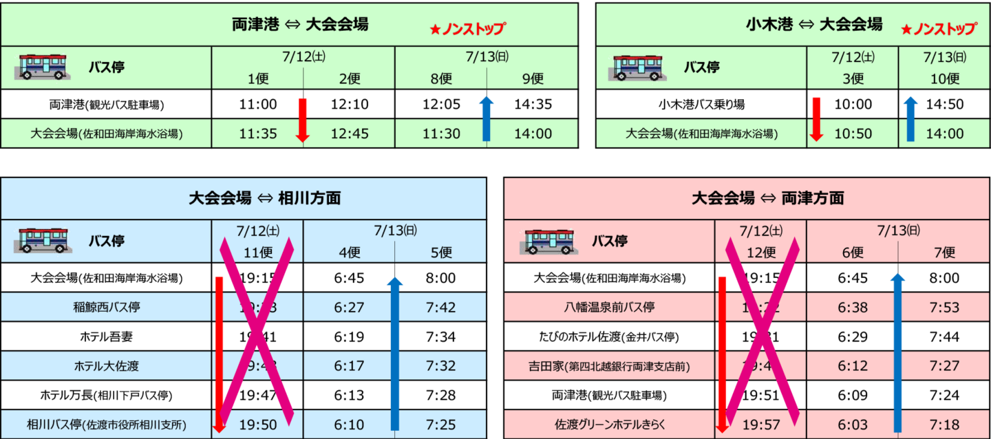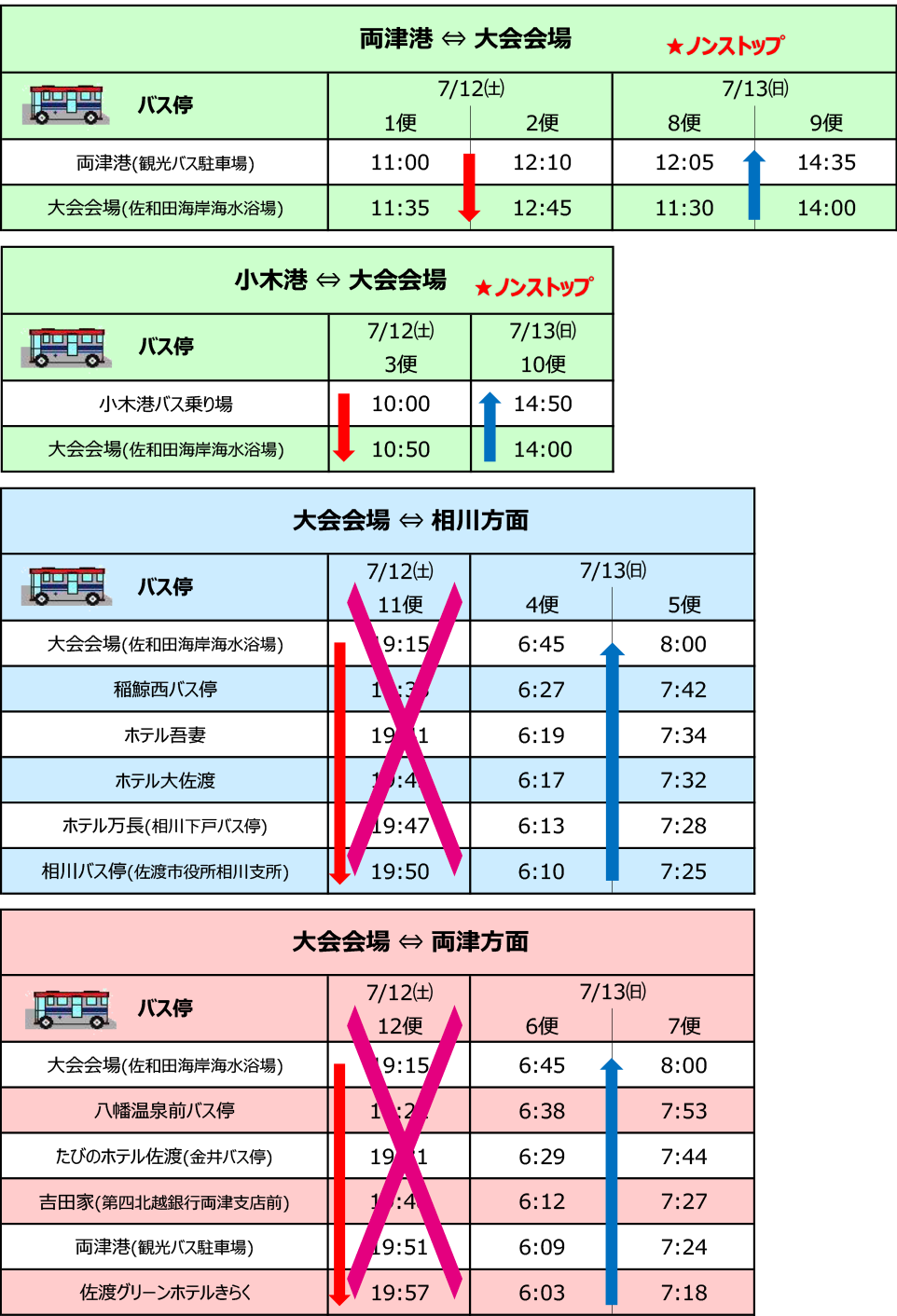 ★相川・佐和田・両津方面に宿泊される方を対象に、参加者及び同伴者がご利用できる無料シャトルバスを配車します。