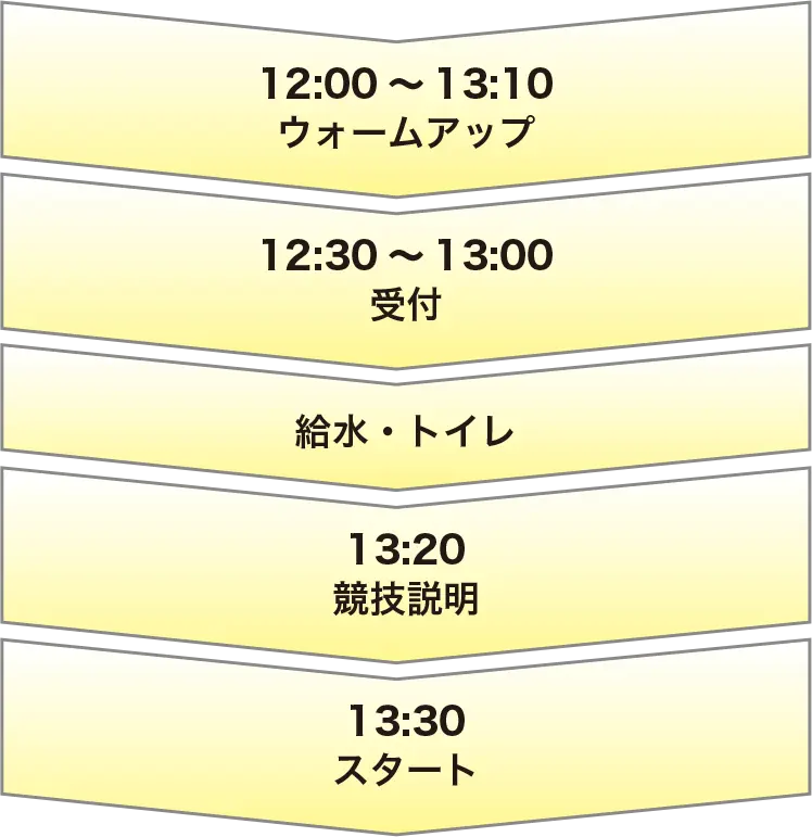 ・必ずウォームアップを行い、体調を確認してください。少しでも体調が普段と違うと感じたら、躊躇せずリタイア申告を行ってください。