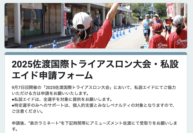 9月7日㈰開催の「2025佐渡国際トライアスロン大会」において、私設エイドにご協力いただける方は、事前登録をお願いします。