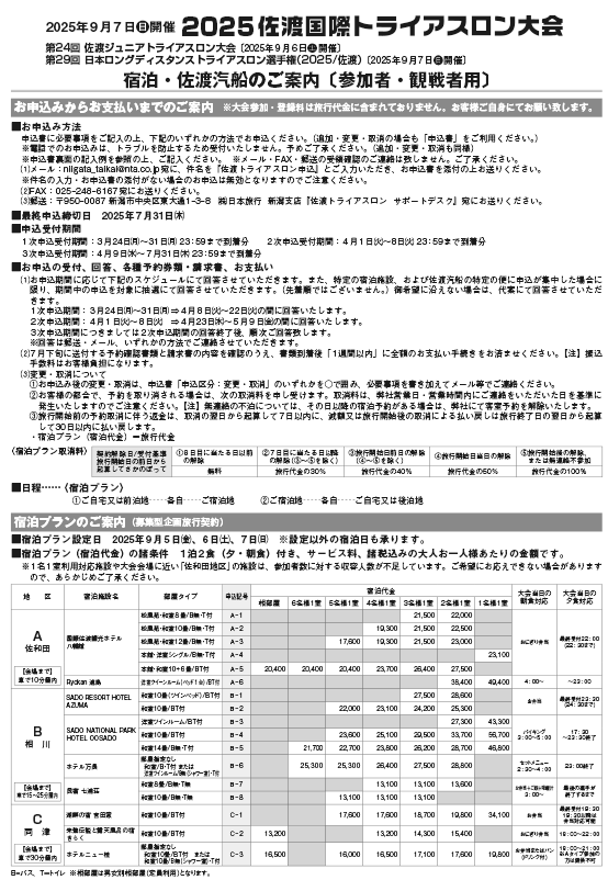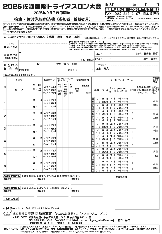 - 〒950-0087 新潟市中央区東大通1-3-8 (株)日本旅行 新潟支店『佐渡トライアスロン サポートデスク』宛にお送りください。
